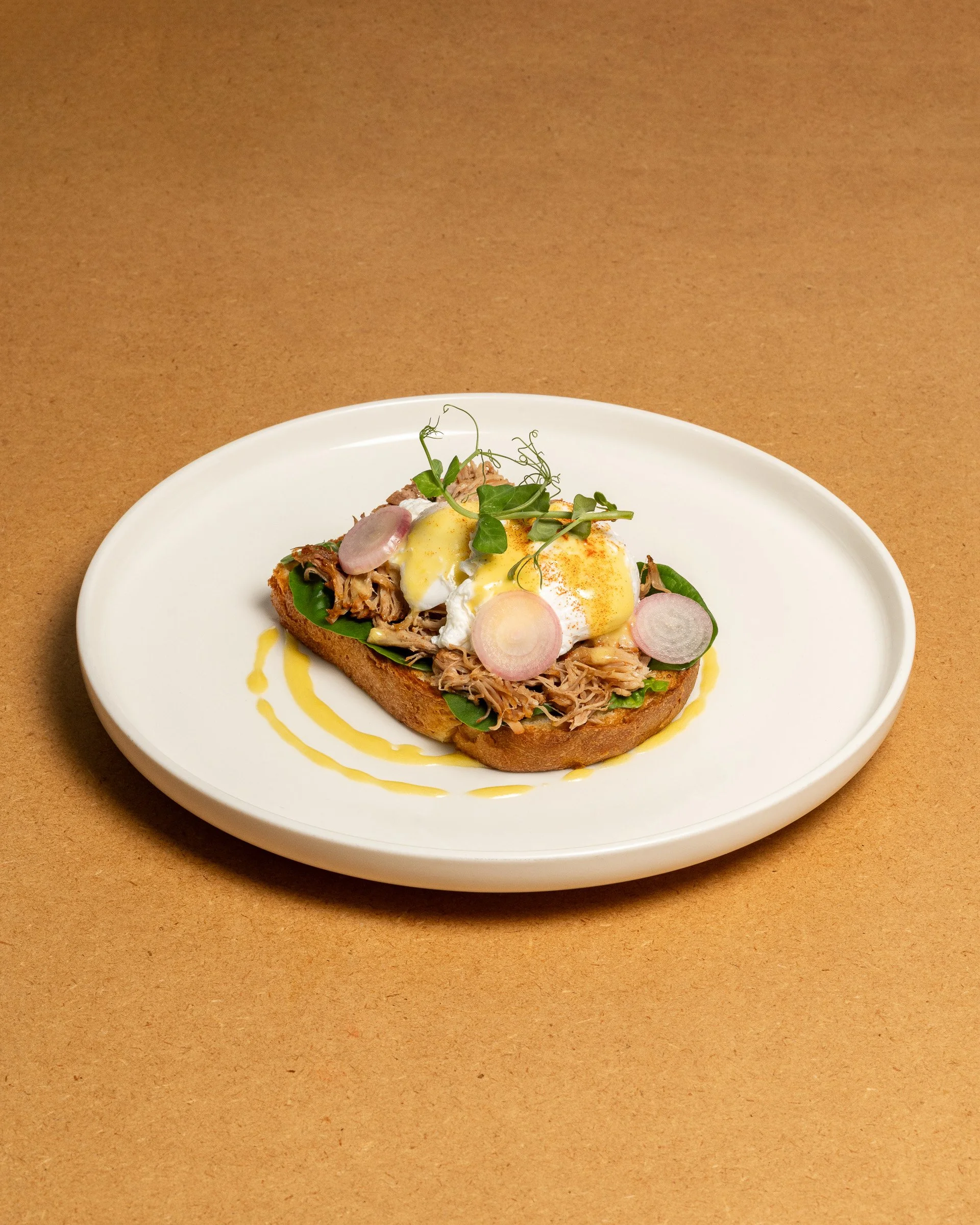 A comforting brunch dish with smoky pulled pork, poached eggs, and lemon hollandaise on brioche toast.